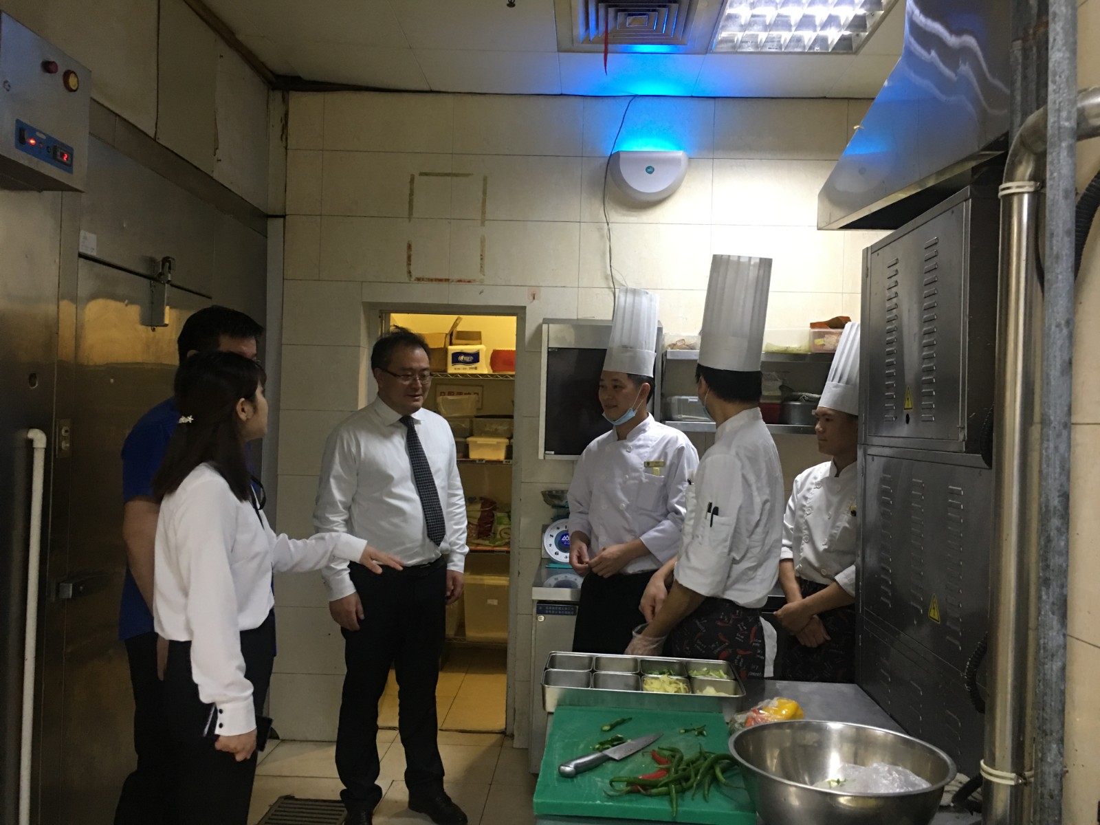 下午,慰问小组来到旷远酒店,在酒店总经理范俊捷的带领下看望了一线员工。大家首先来到位于酒店负一楼的洗衣房,虽然是室内作业,但是当烘干机、洗衣机同时作业的时候,屋内就跟烤箱一样,即使是冬天,大家都是穿着短袖工作;接着大家来到后厨,相信大家对厨师的工作环境并不陌生,锅炉一开起来,整个厨房就是桑拿房,一天湿身两三次也是正常;最后慰问小组来到酒店外围,看望了顶着烈日工作的安保人员。