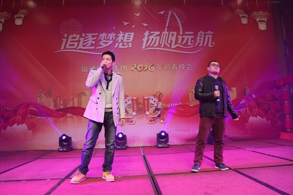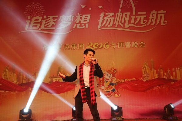 图为2016年迎春晚会董事长王子林上台献唱