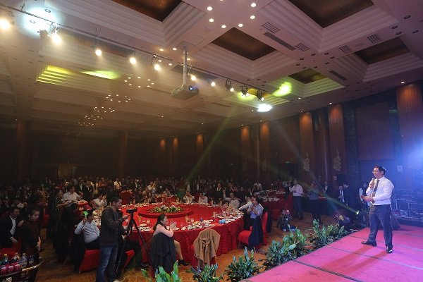 图为2016年迎春晚会董事长王子林上台致祝酒辞